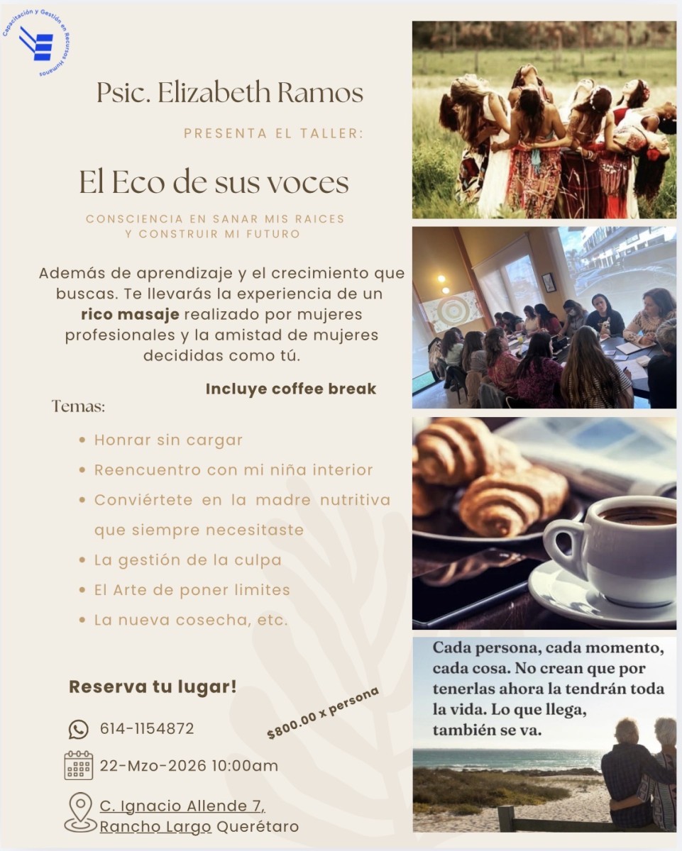 Te invito al taller “El eco de sus voces” en el que por medio de actividades, estaremos sanando nuestra niña interior, cerrando círculos y fidelidades invisibles con comportamientos y mandatos de las mujeres antecesoras de nuestra familia. Además del coffe break, también incluye el material y un delicioso masaje relajante que podrás agendar de acuerdo a tu disponibilidad. Será en un jardín, estaremos en contacto directo con la naturaleza y con mujeres que al igual que tú, les interesa su bienestar emocional.